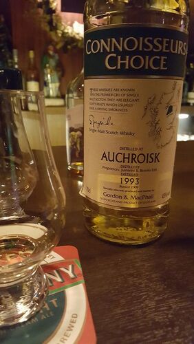 評価:A~A+ 香りはモルティで華やか。シトラス、ハニーシロップ、モルティでクリーミー、パセリなどの香草。 飲むと口当たりは軽く、モルティ、麦汁、軽いスパイスや紙っぽさ。余韻は淡く、生木のニュアンス。 ゴードン&マクファイルのコニサーズ・チョイス…